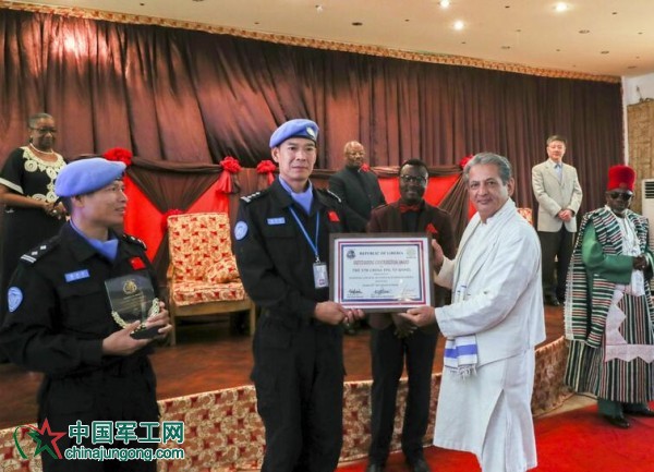 10月28日,在利比里亞蒙羅維亞,中國第五支駐利維和警察防暴隊政委陳利華(左二)接受“利比里亞國家杰出貢獻獎”證書。