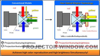 4LCD解決了3LCD在高亮度時(shí)色彩再現(xiàn)能力差的問(wèn)題,4LCD光學(xué)引擎色彩還原能力比同等亮度級(jí)別同樣規(guī)格的3LCD要高20%