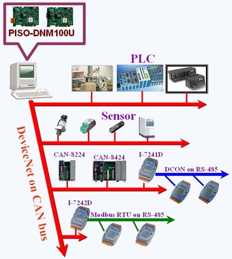 泓格公司的PISO-DNM100U產(chǎn)品不僅能讓您在最短的時(shí)間內(nèi)學(xué)會控制DeviceNet設(shè)備,更能減少您開發(fā)DeviceNet系統(tǒng)的時(shí)間,建立更穩(wěn)定的系統(tǒng),以下將用圖型描繪出一個(gè)典型的網(wǎng)絡(luò)架構(gòu)。