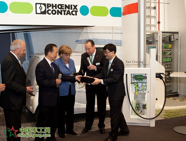 北京時間4月23日下午16時(柏林時間4月23日上午10時),中國總理溫家寶與德國總理默克爾,共同參觀菲尼克斯電氣在漢諾威展會的展臺,并特別觀摩了菲尼克斯電氣中國公司自主研發的EV-BC 750V/400A大電流換電連接器,目前該連接器已成功應用于薛家島的電動汽車智能充換儲放一體化示范電站”工程的電動汽車充、換電站系統項目中。