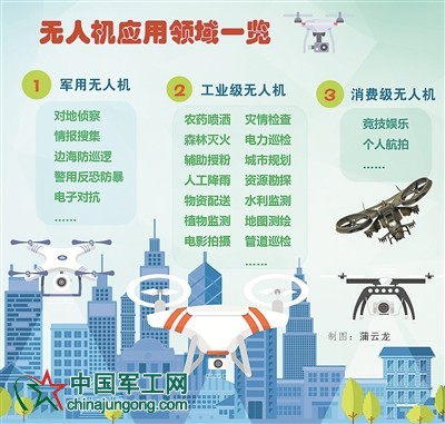 在軍用領域,無人機可以應用于對地偵察、情報搜集、邊海防巡邏、警用反恐防暴、電子對抗等;而支援國家經濟社會建設,又可廣泛應用于國土測繪、海洋巡查、電力巡檢、氣象探測、環境保護和農業植保等眾多領域。