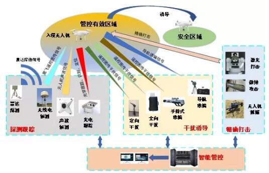 系統(tǒng)集成探測識別子系統(tǒng)(雷達探測、無線電偵測、聲波偵測)、跟蹤取證子系統(tǒng)(光電偵查)、反制打擊子系統(tǒng)(定向干擾、全向干擾、導(dǎo)航對抗、激光打擊、微彈、無人機抓捕)等,通過智能監(jiān)控管理平臺實現(xiàn)“態(tài)勢感知-告警-干擾打擊”一體化、智能化服務(wù),探測識別子系統(tǒng)通過雷達識別和信號識別技術(shù)探測到監(jiān)防區(qū)域入侵的非法無人機,監(jiān)管平臺引導(dǎo)光電設(shè)備鎖定非法無人機位置進行取證,并自動調(diào)度反制打擊子系統(tǒng)對無人機進行信號干擾或武力打擊。