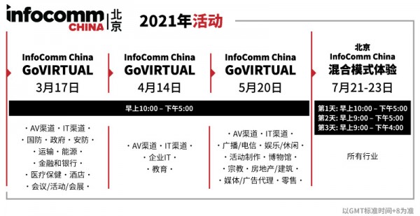 InfoComm China 2021呈獻全新模式,除了7月21-23日在北京的國家會議中心舉行線下展會,在3-5月期間將舉辦三場GoVIRTUAL線上活動。每場線上活動將側重于特定行業舉辦研討會、產品演示等,為業界提供線上虛擬+線下體驗混合模式的新體驗。