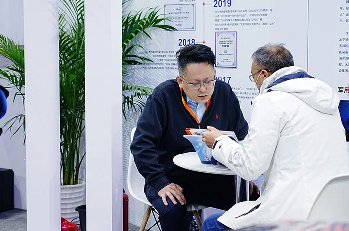 水下機器人是什么?它能做什么用?它的動力來源是什么?在渾濁水體內,機器人如何完成任務?仿生機器人的運動原理是什么?它能不能達到我的任務需求?許多參觀者都帶著疑問來到我們的展臺。針對這些問題,產品、技術、業務相關的負責人在現場逐一為來訪觀眾解答,現場討論氣氛熱烈。