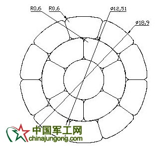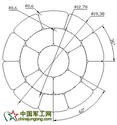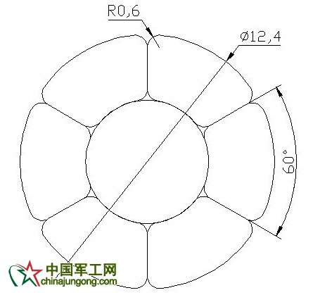 復合芯的直徑為6.0mm,則內層鋁層直徑為(18.8+6.0)/2=12.4mm。利用AUTOCAD進行圖形繪制,由于內層型線是6根,則型線圓心角為60°,如圖2所示: