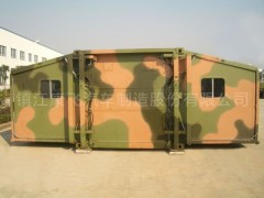 用途:可作為野戰(zhàn)指揮所、野戰(zhàn)宿營(yíng)所、野戰(zhàn)醫(yī)院及野戰(zhàn)飲食保障所 等使用。作業(yè)能力:展開后可形成33.6㎡的場(chǎng)所。主要配置:液壓自升降結(jié)構(gòu)、發(fā)電機(jī)組、空調(diào)系統(tǒng)、液壓系統(tǒng)、選裝設(shè)備,艙體為兩側(cè)擴(kuò)展的形式,前面為工作艙,后面為動(dòng)力艙,專利技術(shù)生產(chǎn),密封性良好,滿足各種戰(zhàn)技指標(biāo)。