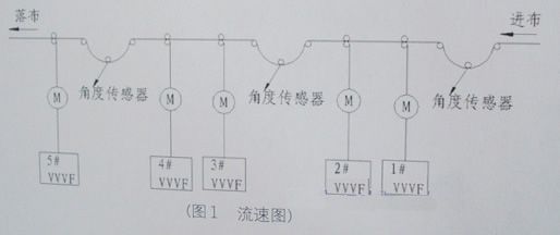在降低變頻器成本的基礎(chǔ)上實(shí)現(xiàn)五臺(tái)電機(jī)同步調(diào)速,1號(hào)、3號(hào)、5號(hào)電機(jī)要求能自動(dòng)隨張的變化大小,達(dá)到布的松緊始終一致。2號(hào)電機(jī)要求能夠?qū)崿F(xiàn)瞬間調(diào)速功能,即用手按下快進(jìn)或慢進(jìn)按鈕,頻率會(huì)立即加快或減慢幾Hz,松開(kāi)按鈕能回到原來(lái)的頻率繼續(xù)運(yùn)轉(zhuǎn),4號(hào)電機(jī)通過(guò)外部電位器可以微調(diào)。(見(jiàn)圖1)