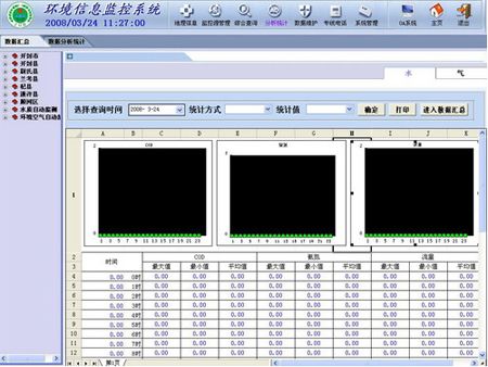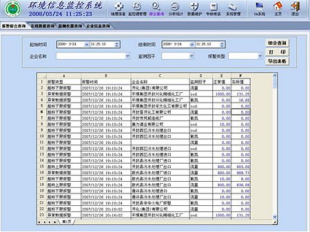 提供多種條件查詢方式和查詢結果分類、分項排序、統計最大值、最小值、平均值、匯總值等分析處理功能。提供統計各類監測數據功能,如流量統計;COD、氨氮濃度分析;COD、氨氮排放總量統計;煙氣流量統計;煙氣、煙塵、CO、SO2、NOx濃度分析;煙氣、煙塵、CO、SO2、NOx排放總量統計等。提供查詢結果打印功能