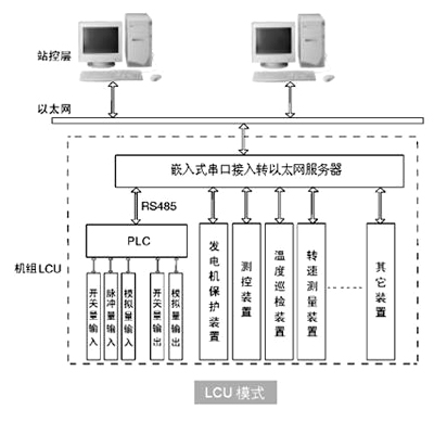 LCU的設備包括PLC,保護、測控裝置,溫度巡檢、轉速信號以及調速和勵磁等智能設備,以及以串口RS485/RS232方式接入并轉換為以太網接入的嵌入式服務器