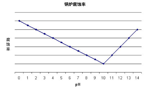鍋爐給水的正確處理是降低鍋爐硬件發生潛在損害的主要辦法。完成處理的正確方法是在一個窄帶范圍內控制給水的pH值。下圖顯示了如果水中的pH值變為酸性或堿性,在腐蝕逐漸增加的影響下,在pH值10左右時鍋爐腐蝕率最低。