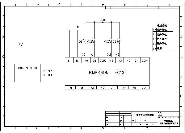 采用一臺EC20-1006BRA作簡單的繼電連鎖,除了和舊系統進行連鎖(互鎖),還有變頻器的簡單啟動和停止及報警。本系統還另外裝有一臺EC20-1006BRA,通過串口與一臺數傳電臺相通訊(MODBUS),來實現和另外一個水泵房(凈環泵房)實現連鎖。當璇流井有高液位報警時,通過PLC及數傳電臺傳送到凈環泵房,由操作人員確定水泵的啟動和停止(由于二者距離太遠,且不適合電纜敷設,所以采用無線數傳的方式)。 其中璇流井內PLC設置為主站,凈環內PLC為從站。數傳電臺采用深圳科立訊生產的PT6080無線數傳電臺是利用先進的單片機技術,無線射頻技術,數字處理技術設計的功率較大,體積較小的模塊式半雙工數傳電臺,采用SMT新工藝,選用高質量的元器件。抗干擾能力強,精致堅固,結構緊湊,安裝方便。數話兼容,數傳可優先。RS232、RS485及TTL多種接口可供選擇,適應面寬。參見下面原理圖: