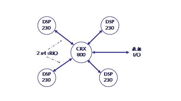 DSP 模塊 DSP230 集成的 4 片 MPC8640D 處理器以 sRapidIO 交換芯片和 PCIe 交換芯片為核心組成星型架構(gòu),并以 sRapidIO 和 PCIe 對外互聯(lián)。 DSP230 以交換模塊 CRX800 為核心組成星型架構(gòu)。系統(tǒng)邏輯架構(gòu)示意圖見圖 1-1 。