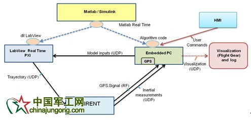 我們在實時操作系統(QNX或VxWorks)中運行一個PC/104單元,操作系統中包含了算法和控制策略,用于測試自動代碼生成工具和集成架構創建的代碼的完成。我們在現場實驗的真實無人機中也使用了相同的單元。