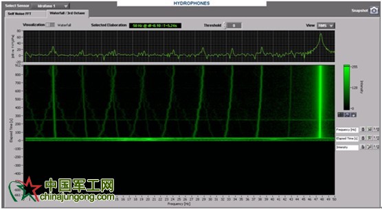 SDMS可以對水聽器和加速度計原始數據進行FFT分析。對于水聽器信號,原始數據將根據應用頻譜分析來完成實時自身噪音計算、一個瀑布圖,以及1/3倍頻程圖形顯示的時頻頻譜關系。同樣的,系統會持續對每一個傳感器進行加速度計FFT計算。